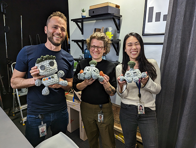 Here are three Googlers, Cherry, Lizzi and Daniel, holding Crawley – that is the name for Googlebot. Lizzi makes these awesome crochet Googlebots and here are her Google colleagues holding them.