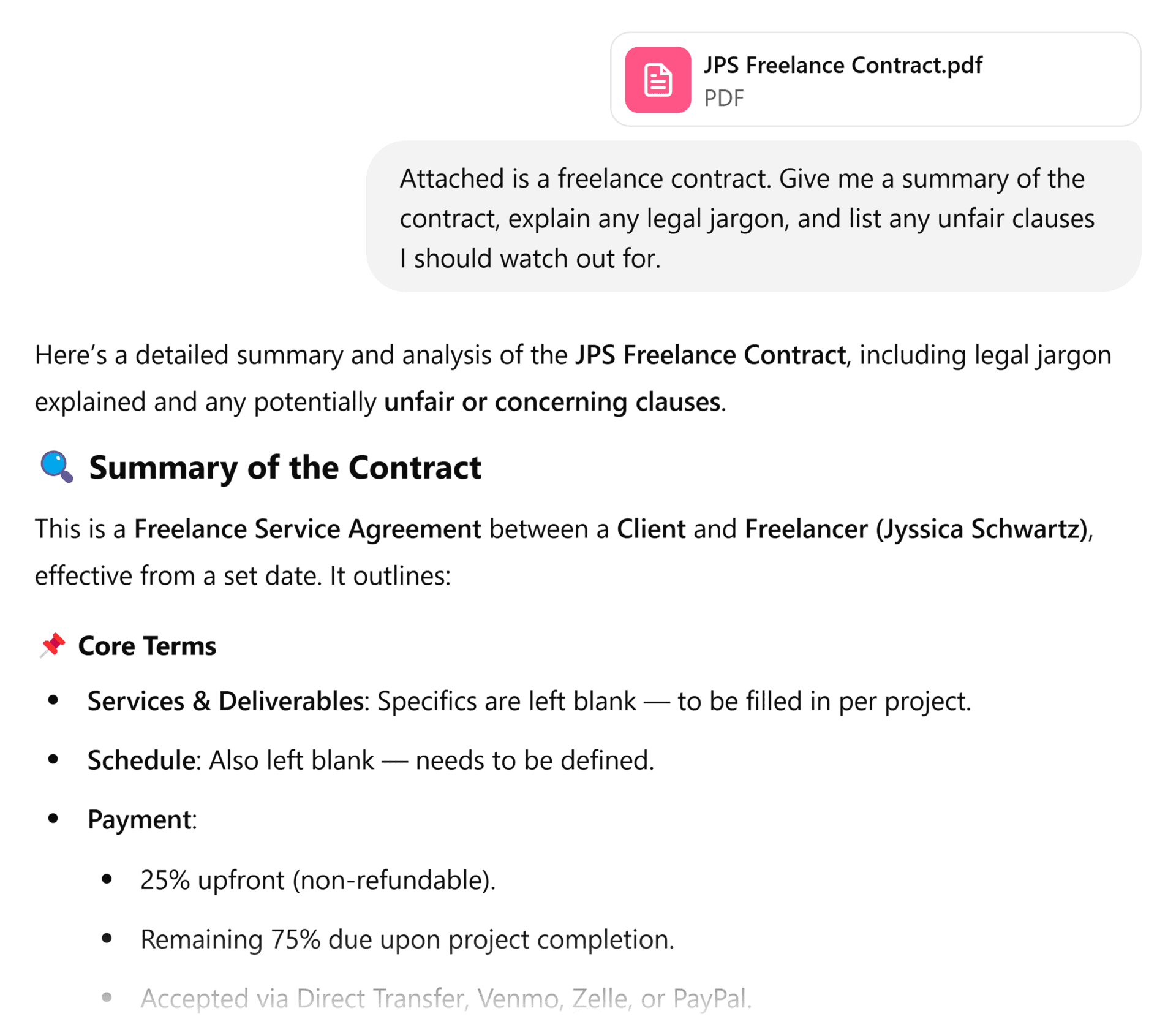 Upload a PDF, like a client agreement, and ask it to explain the legal jargon. Or point out unfair clauses.
