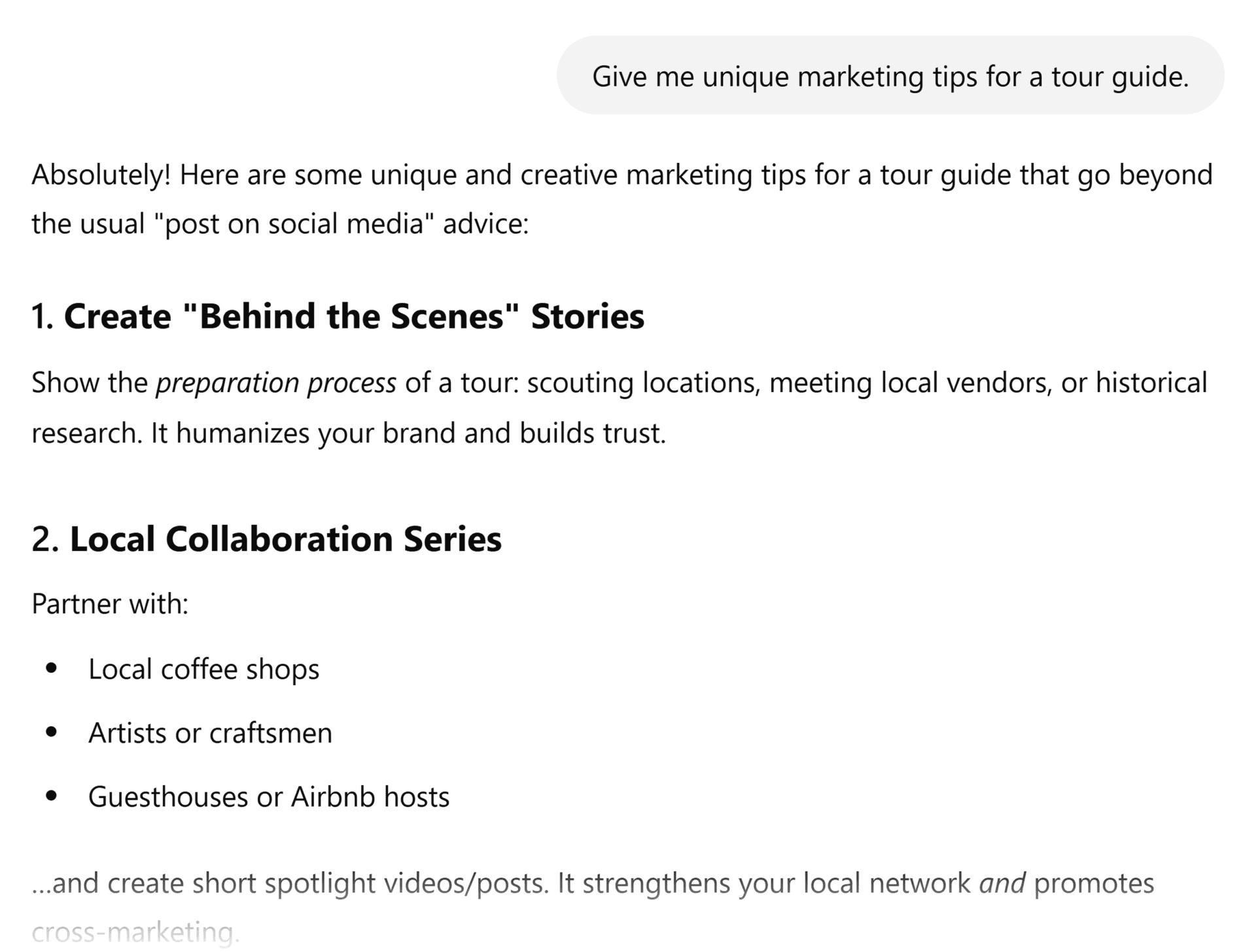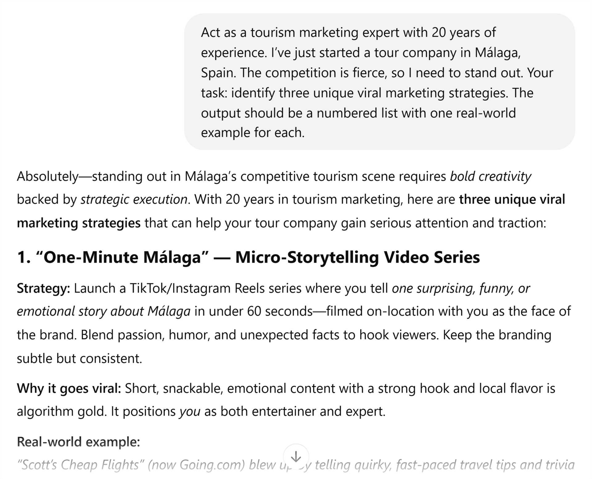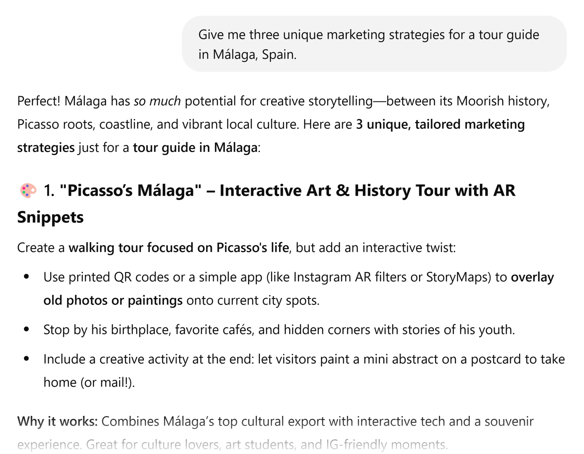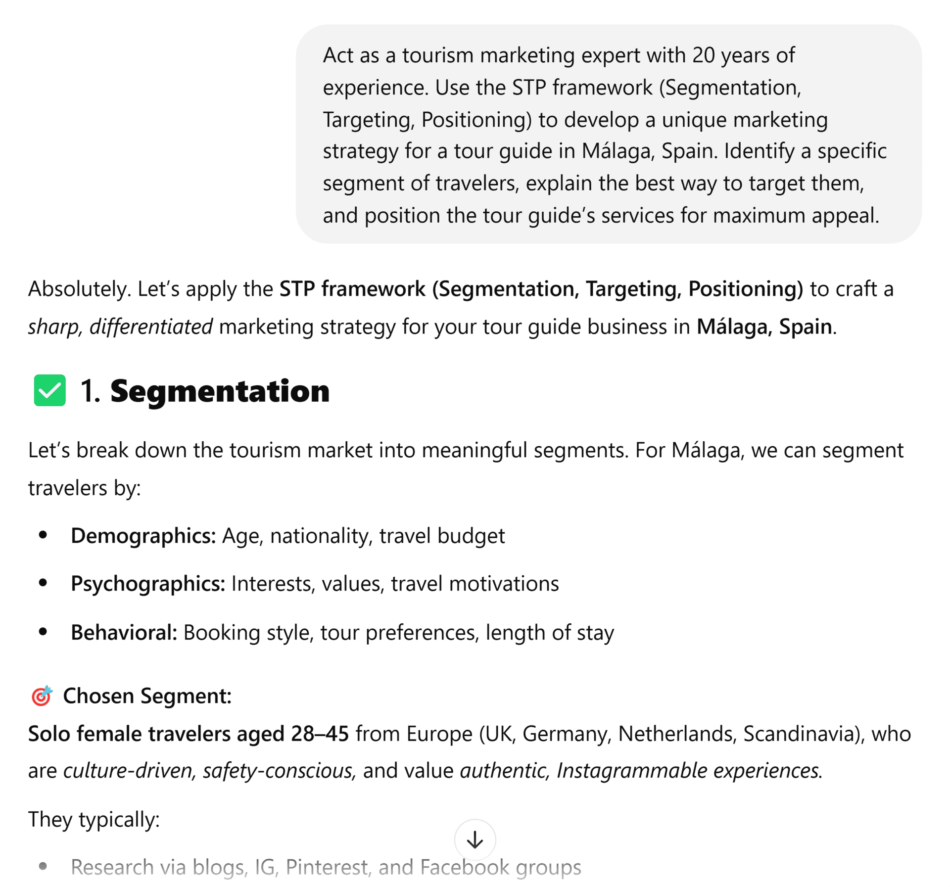 For example, in the Málaga tour guide prompt above, try using the STP framework (Segmentation, Targeting, Positioning).