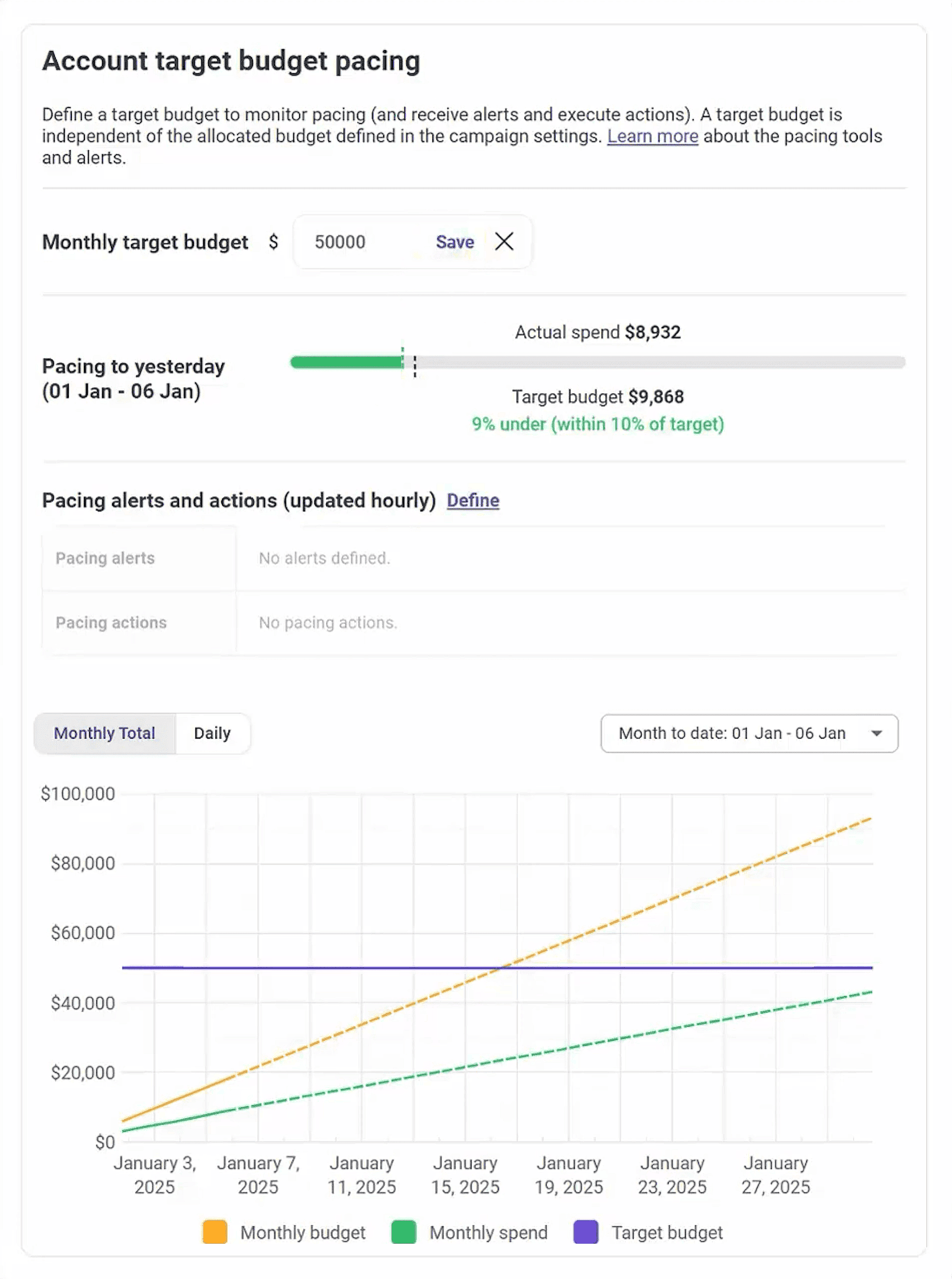 With manual pacing, you can set daily or monthly spend targets and monitor progress in a visual dashboard.