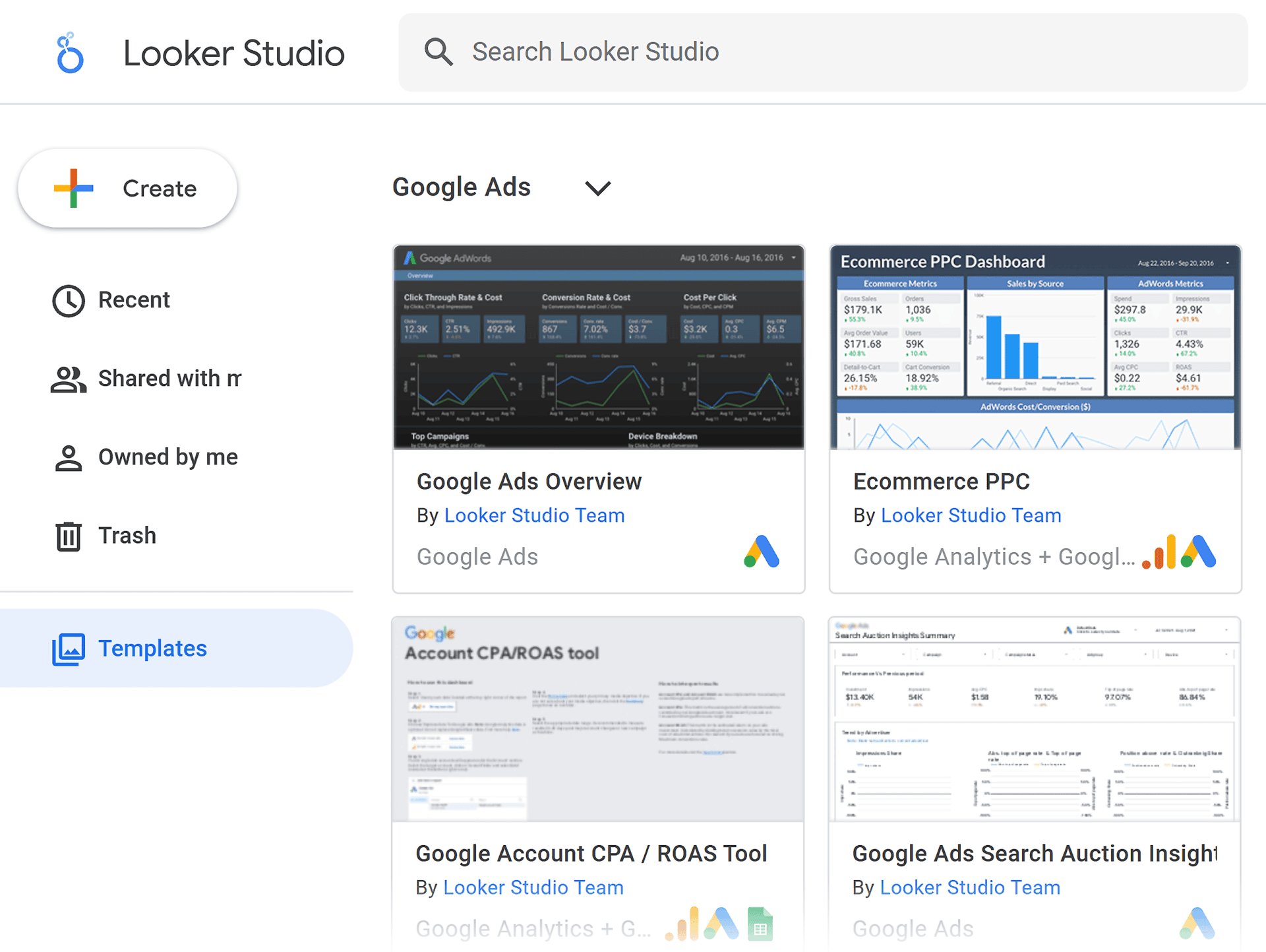 Google Looker Studio helps you build reporting dashboards using data from Google Ads, GA4, Search Console, BigQuery, Google Sheets, and more.