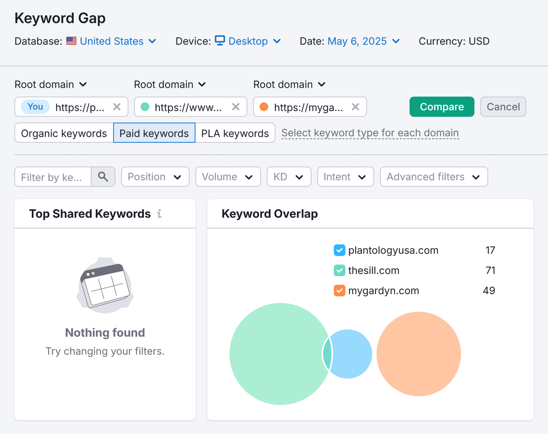 Add a few competitor URLs — like mygardyn.com and thesill.com — and Semrush will show keywords they’re targeting, but you’re not.