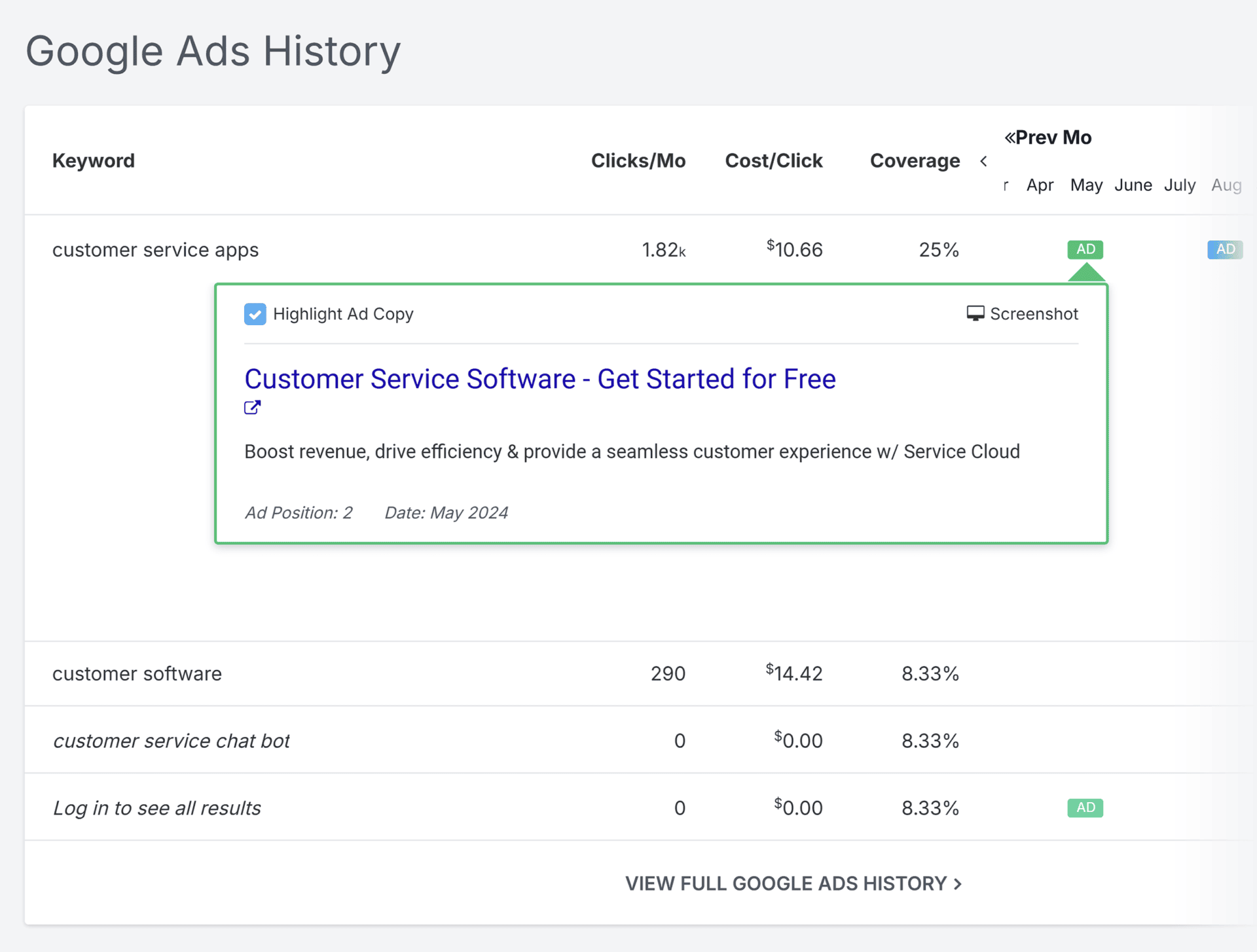 You’ll see years of PPC history, including the keywords that triggered each ad, estimated CPC, and the exact ad copy.