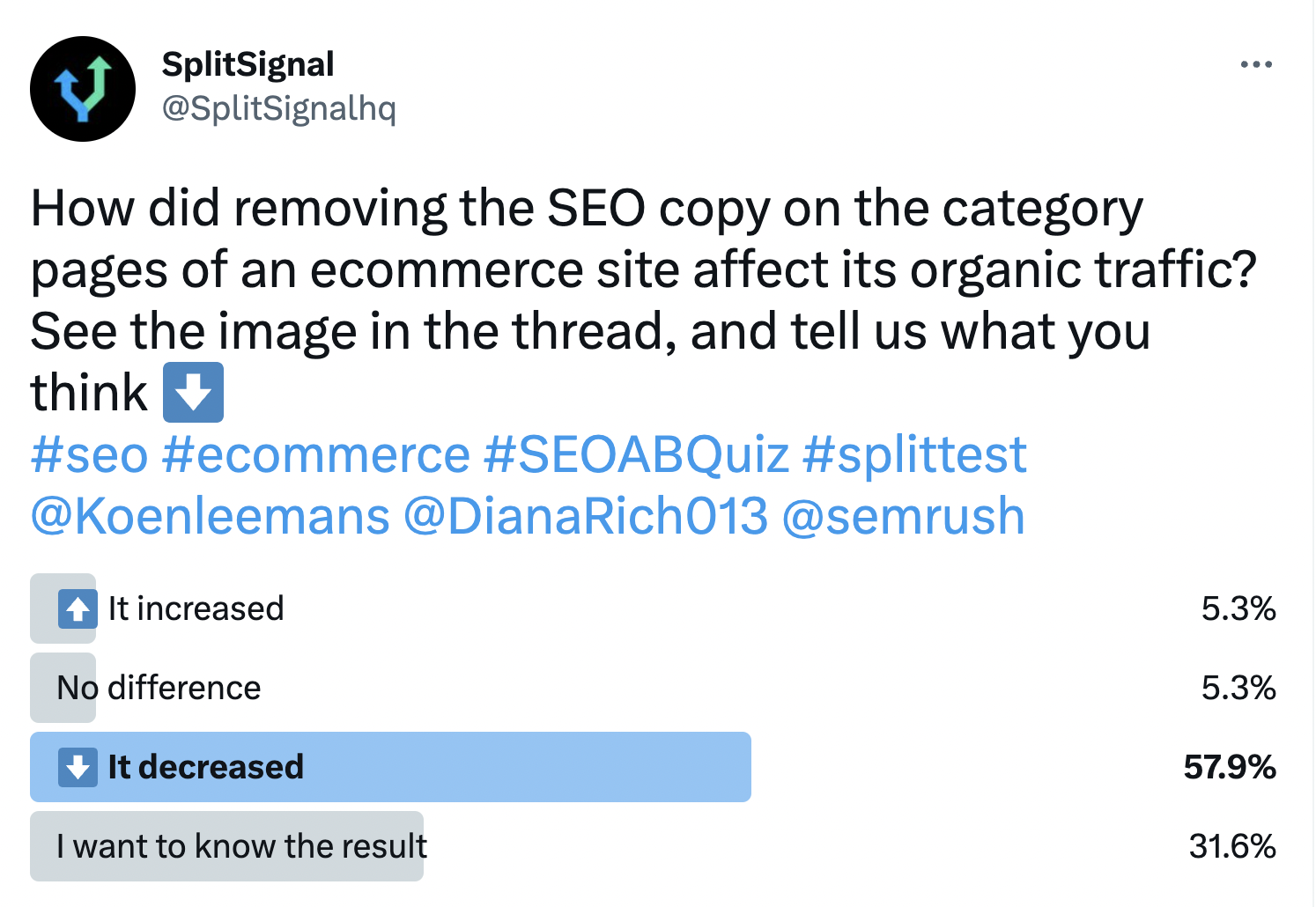 We recently conducted a split test for one of our major ecommerce clients, where we removed the SEO content from the top of their category pages to evaluate its impact on organic performance and search engine visibility.